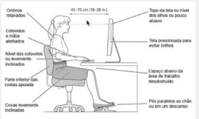 Já as mãos e os punhos precisam ficar retos, sobre a mesa, enquanto se utilizada teclado.