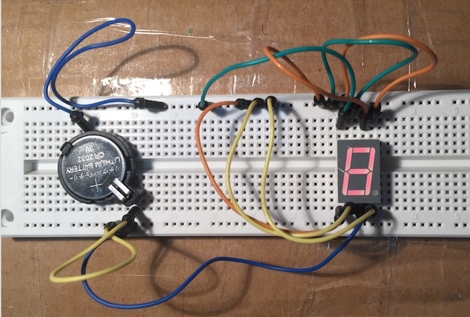 Primeiro colocaremos o Display LED com o anodo (positivo) virado para o lado que conectaremos os 3V positivo; Para identificar o anodo do Display LED, basta colocar a ponta de teste positiva do multimentro no pino do meio e o outra ponta em qq pino exceto o do meio oposto. Se o multimetro for diferente zero então é o anodo. Caso contrario inverter olado do disply Led.
